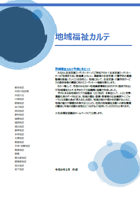 市内にある各まちづくり協議会(22地区)を単位として、人口・世帯・高齢化率のデータをはじめ、地域の福祉・医療・教育等の社会資源やインフォーマルな活動も含め「見える化」を図り、地域の強みや弱みを把握するとともに、地域の魅力や課題を共有するため作成しました。地域福祉活動への参加意識の醸成と今後の活動の活性化につながるよう活用していただけたらと考えています。